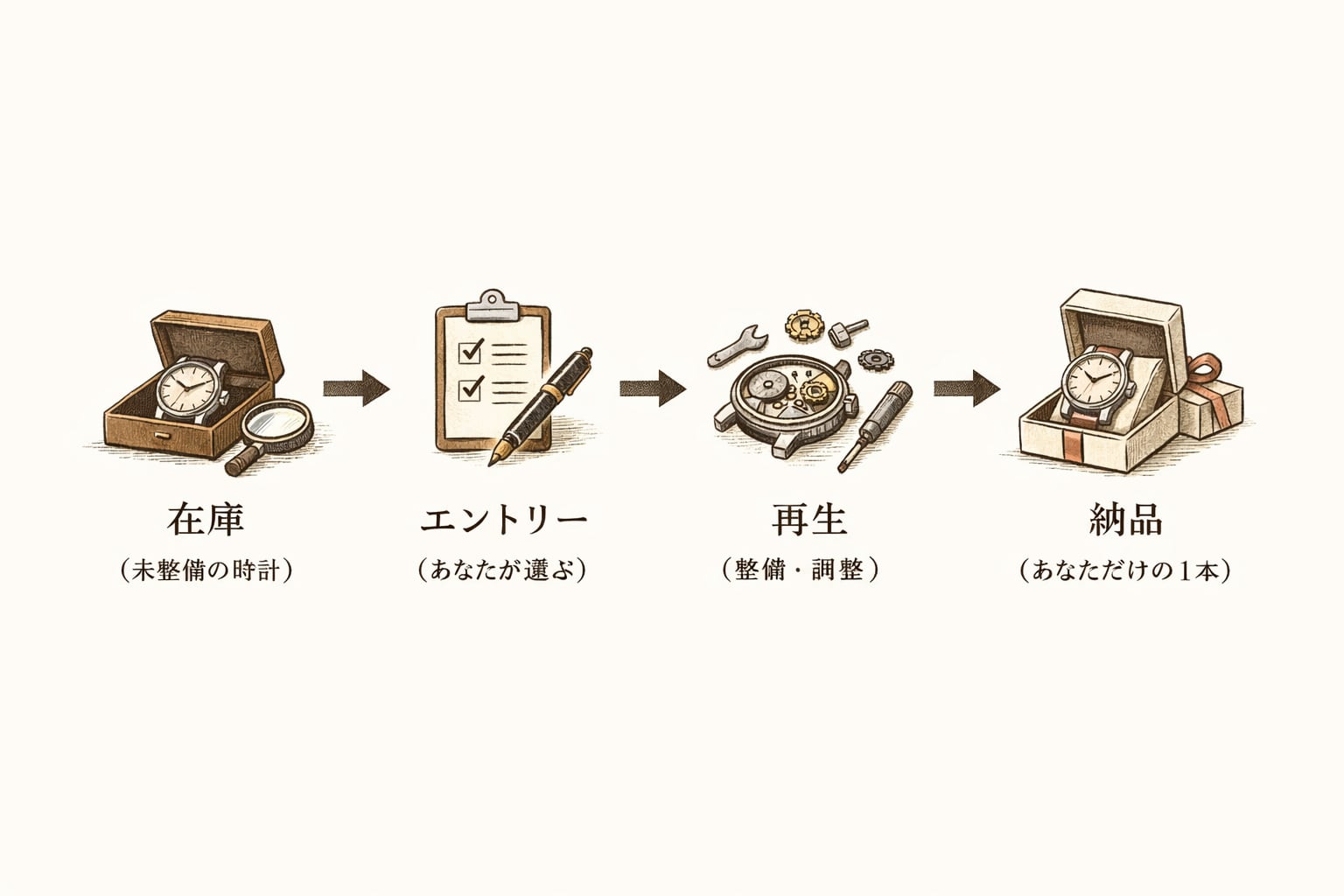 在庫として存在する時計を、迎えてくださる方のために再生し、お届けします。